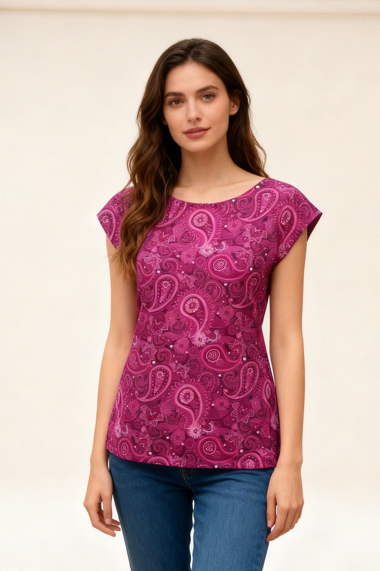Dámské tričko s přinechaným rukávem. Velmi slušivý střih, ideální nejen na teplejší dny (tričko je pod paží volnější, než u klasického rukávu, díky čemuž "větrá" :-) ).