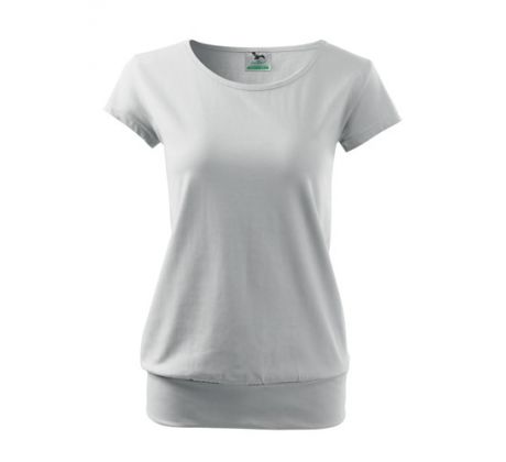 Trendové dámské triko s velmi krátkým rukávem, volnějšího střihu, v dolním kraji všité do širokého lemu. Kulatý průkrčník s úzkým lemem ze shodného materiálu. Ramena zpevněna všitým proužkem. Triko sahá do hloubky boků. Silikonová úprava zajišťuje měkký a splývavý omak