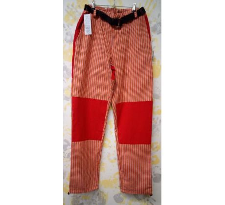 Outdoorové kanafasové kalhoty: všitá kolena a zadek, v pase přezka s pásem, dvě kapsy v bocích a jedna na zadku, stahování nohavic dole na brzdičky.