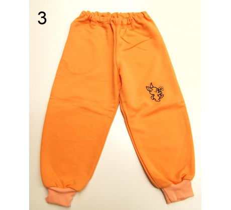 Tepláky jsou v pase do gumy v tunýlku (lze upravovat), v pravém bočním švu mají kapsičku. Zakončené jsou do bavlněné manžety. Střih je vhodný i pro hubenější děti.
