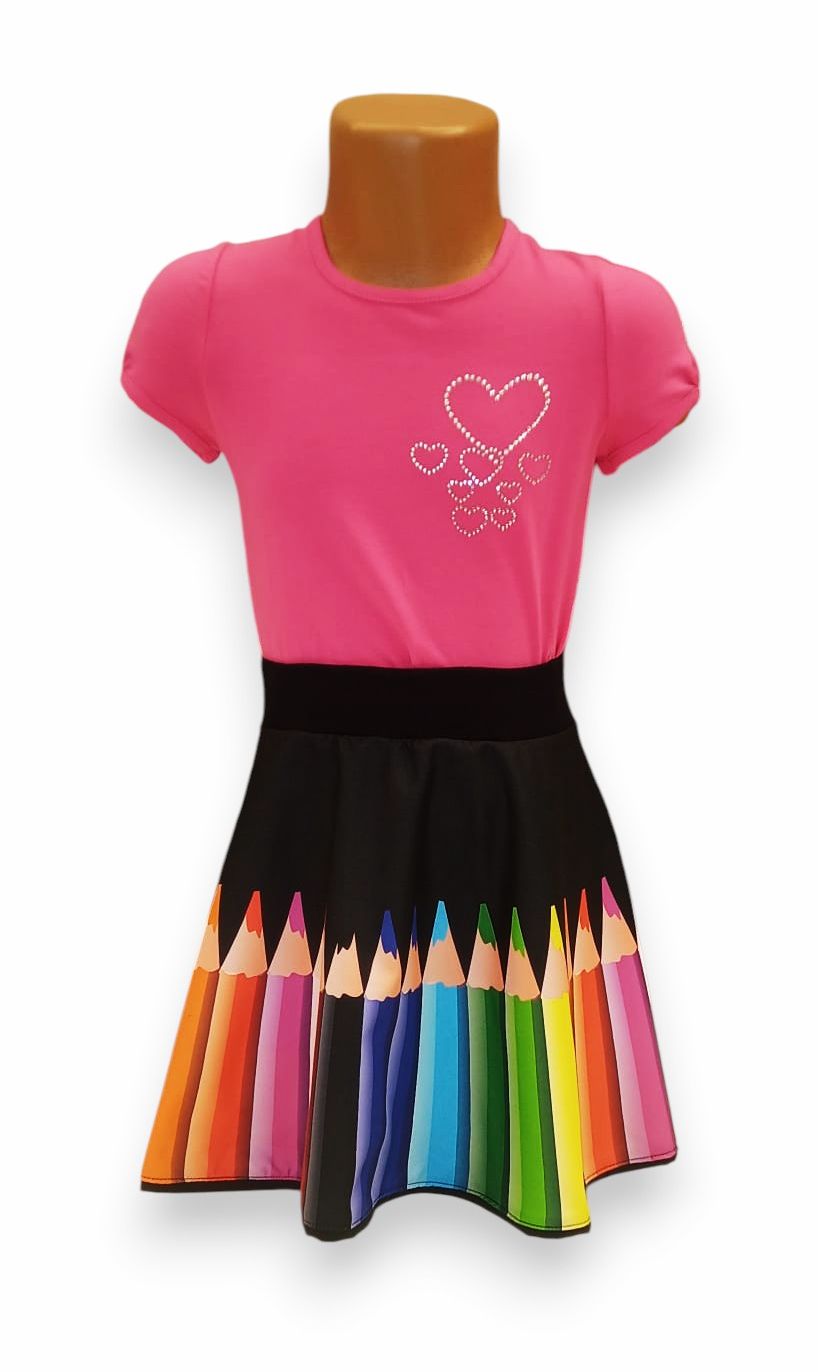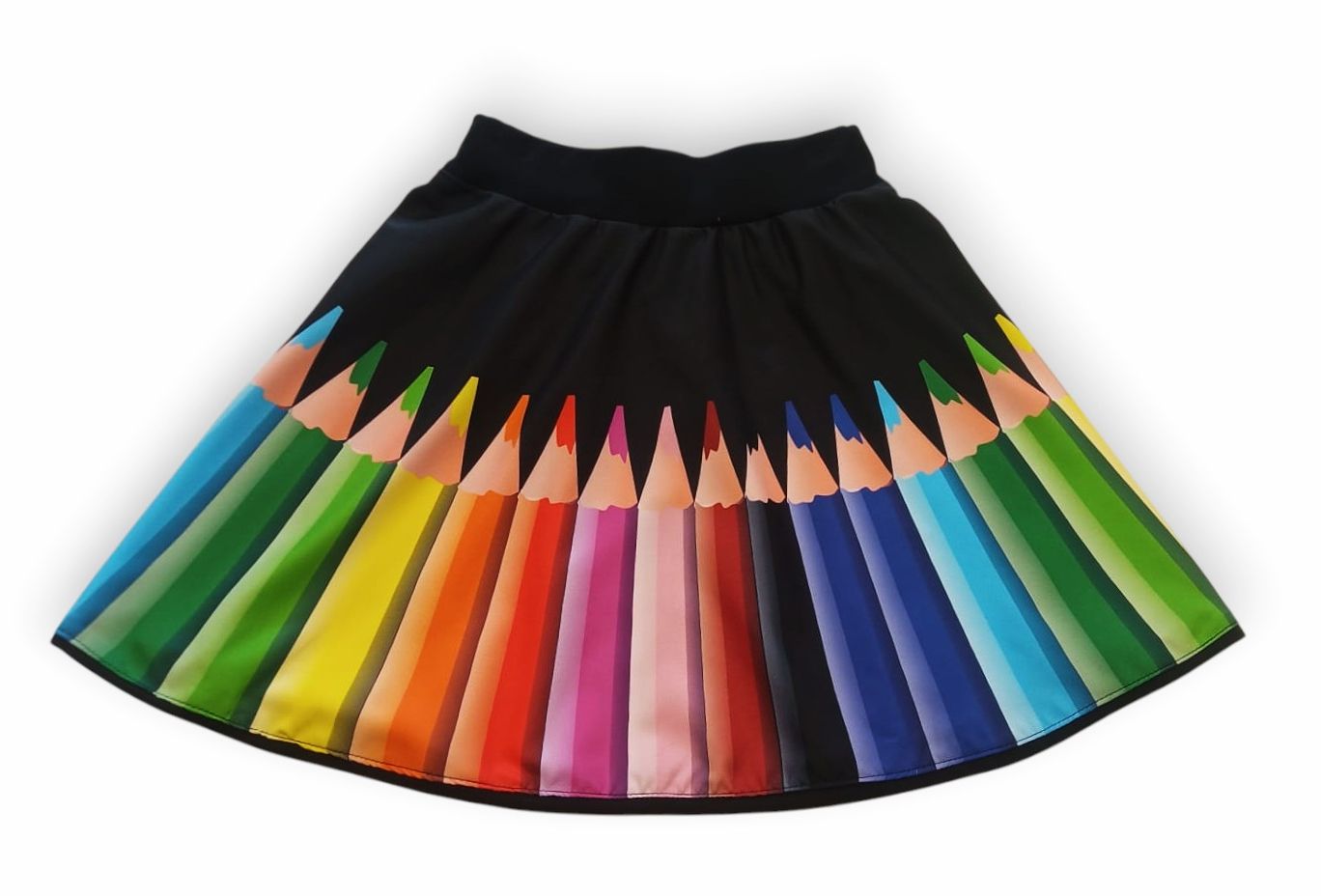 Půlkolová sukně z lehkého plátna s nádherným tiskem pastelek. Kousek, který zaručeně potěší každou mladou slečnu.